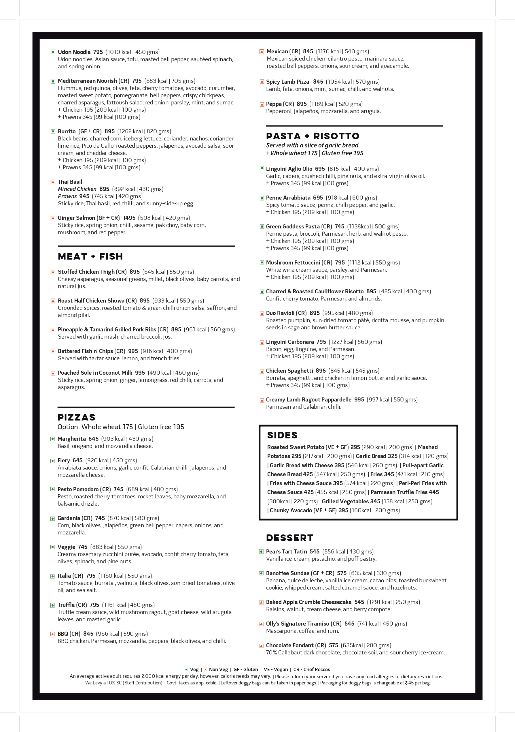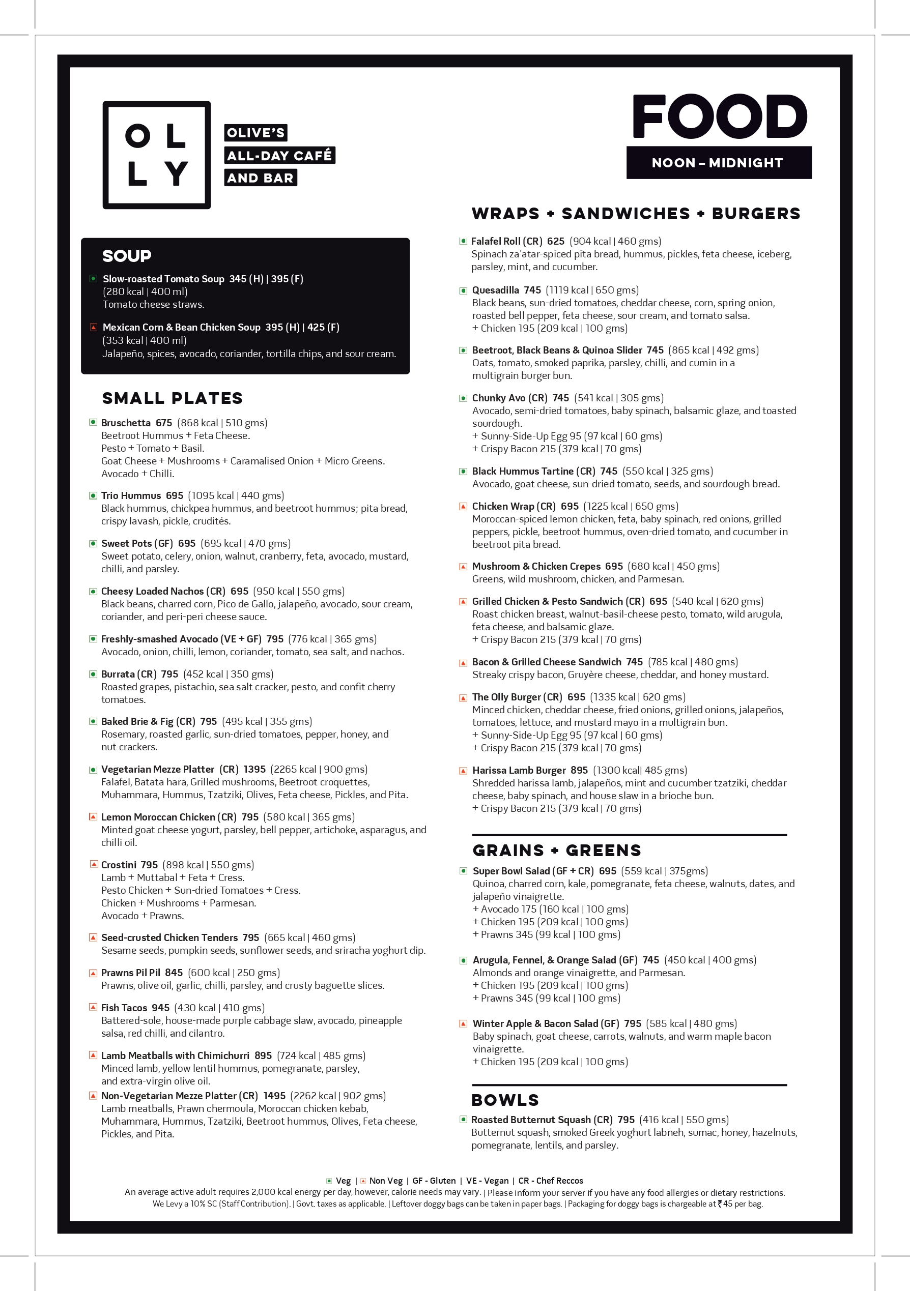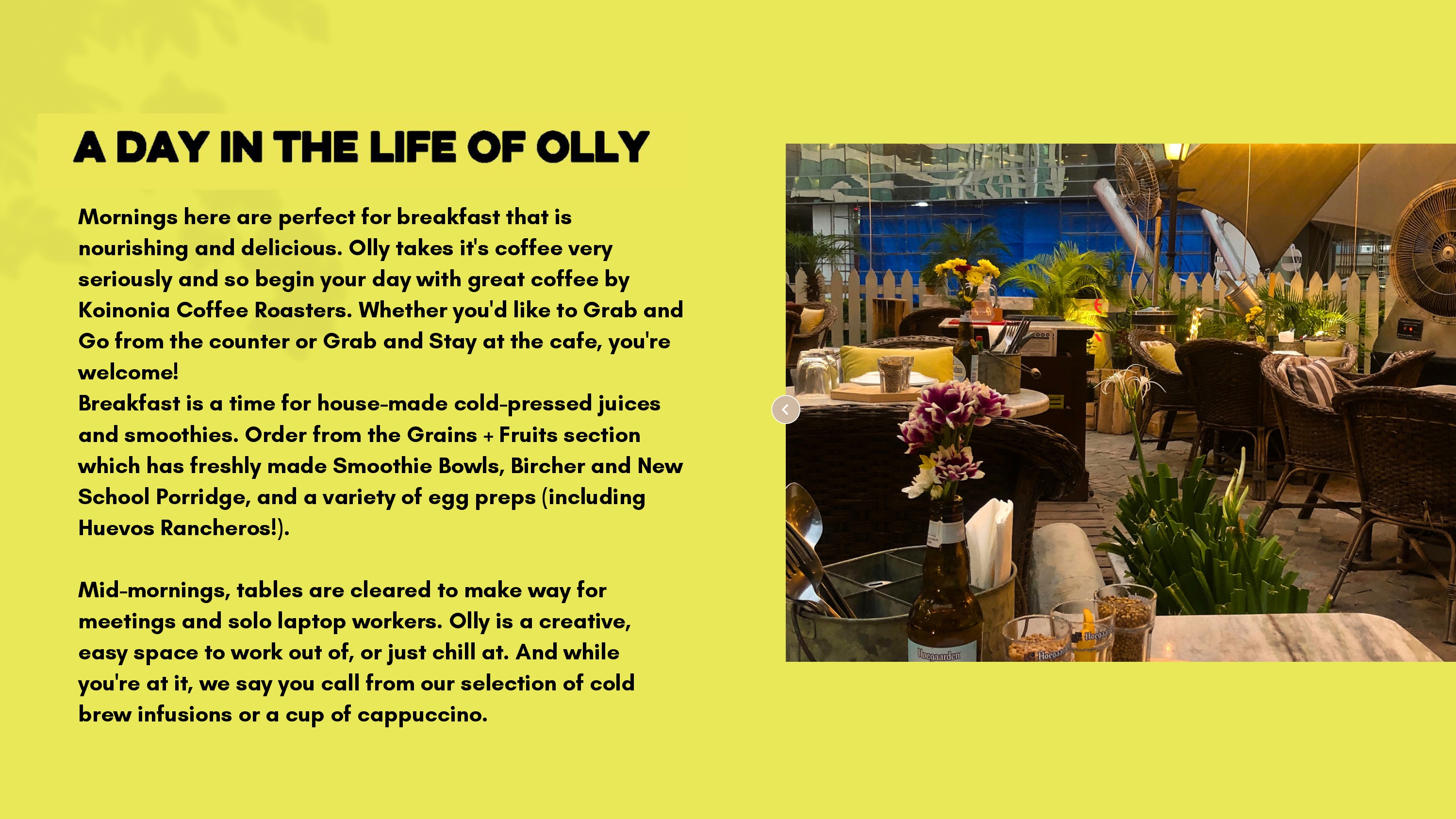 Freshly brewed coffee, bespoke drinks, artisanal cocktails that are free of synthetic ingredients, house-made cold-pressed juices, spritzers, and a café menu of the greatest hits are just a few of Olly’s everyday elements. Think superfood salads, hand-rolled pizzas and pastas, small plates and large, grains + greens, and homemade desserts - all with a focus on seasonality and freshness.