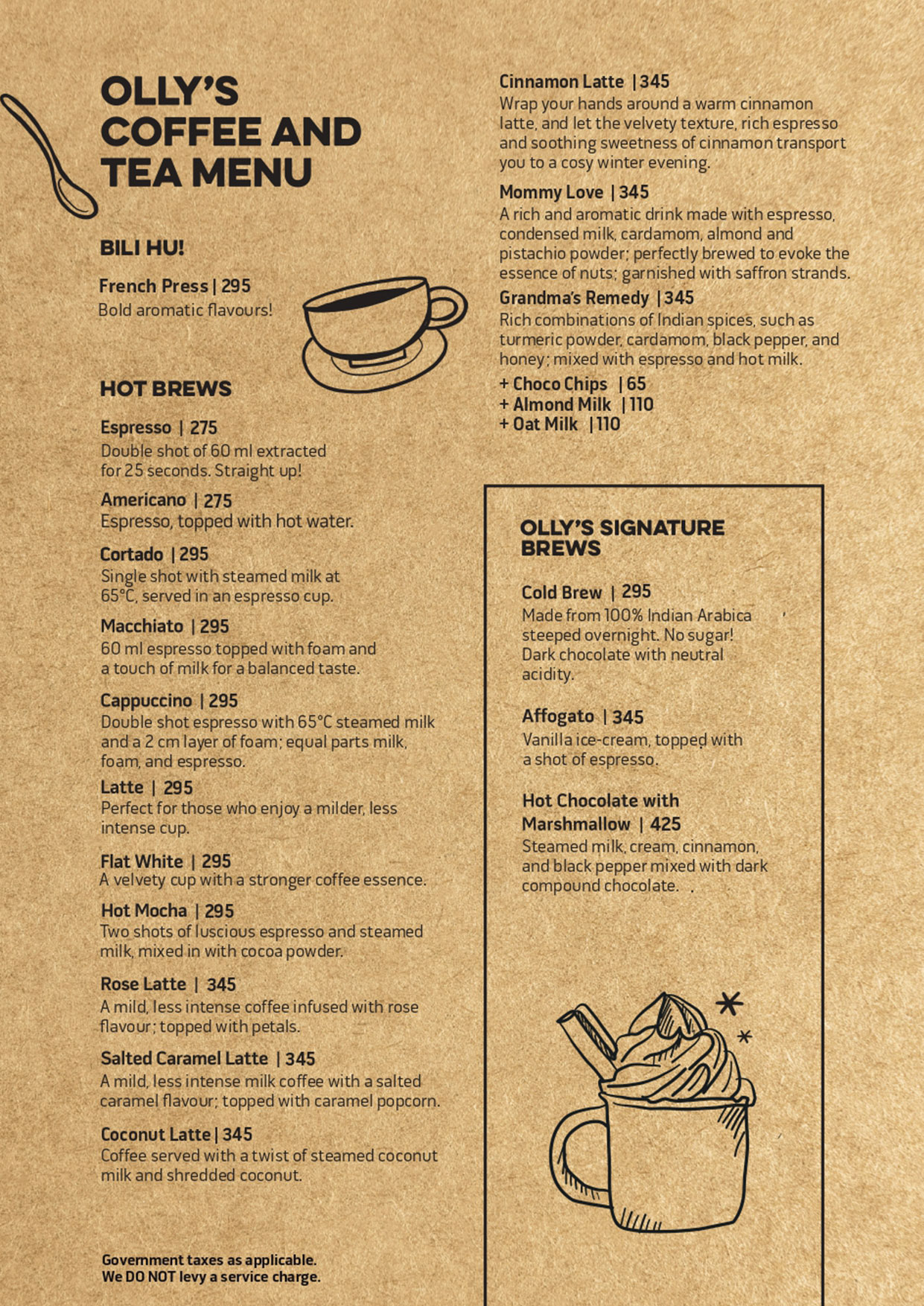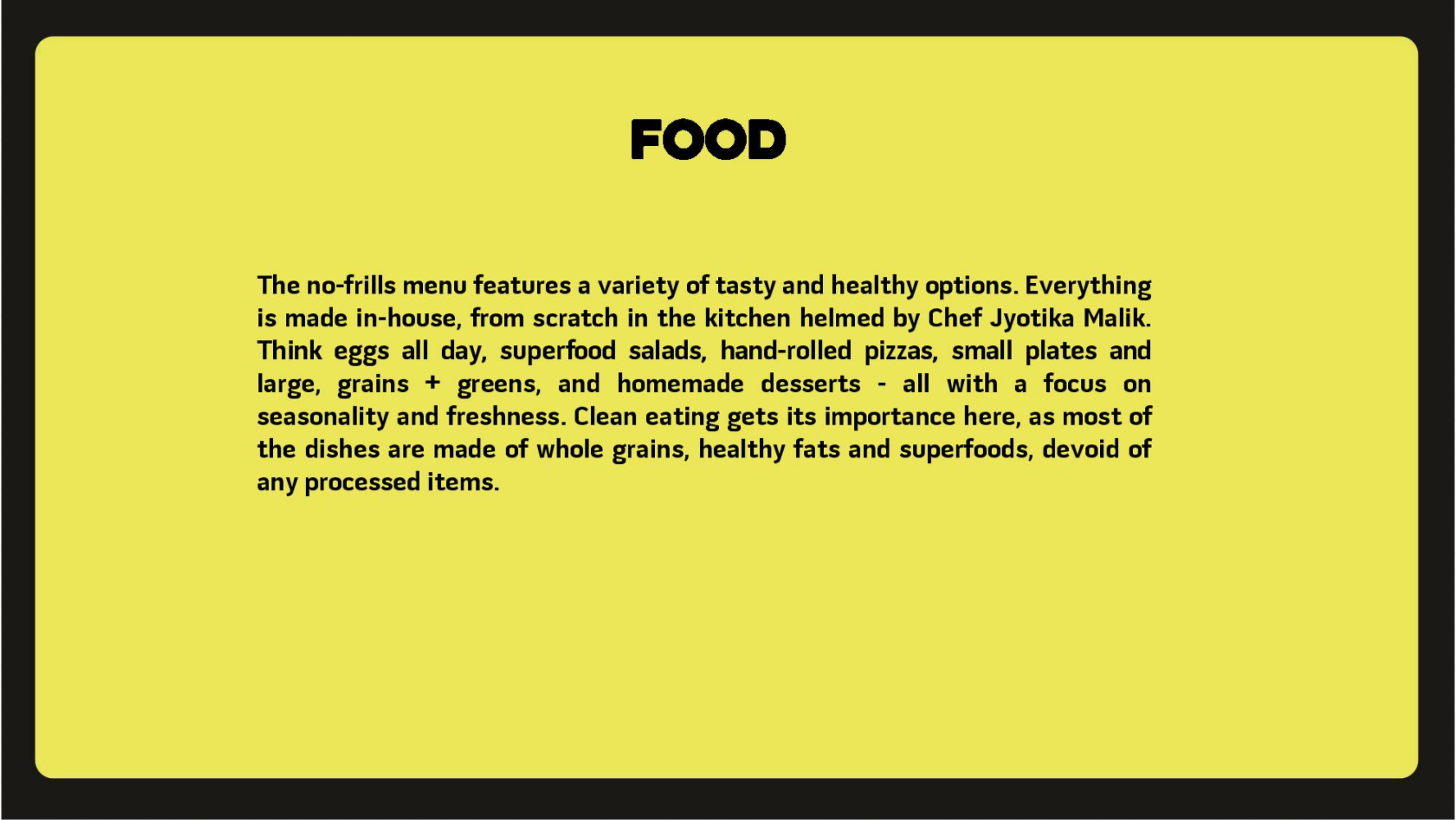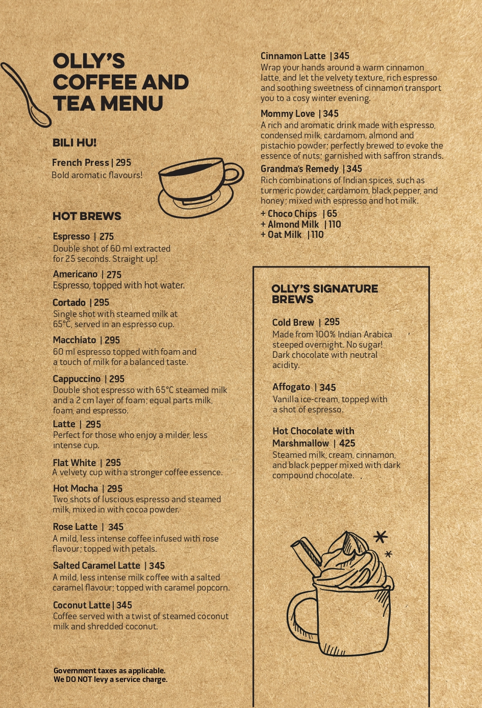 Freshly brewed coffee, bespoke drinks, artisanal cocktails that are free of synthetic ingredients, house-made cold-pressed juices, spritzers, and a café menu of the greatest hits are just a few of Olly’s everyday elements. Think superfood salads, hand-rolled pizzas and pastas, small plates and large, grains + greens, and homemade desserts - all with a focus on seasonality and freshness.