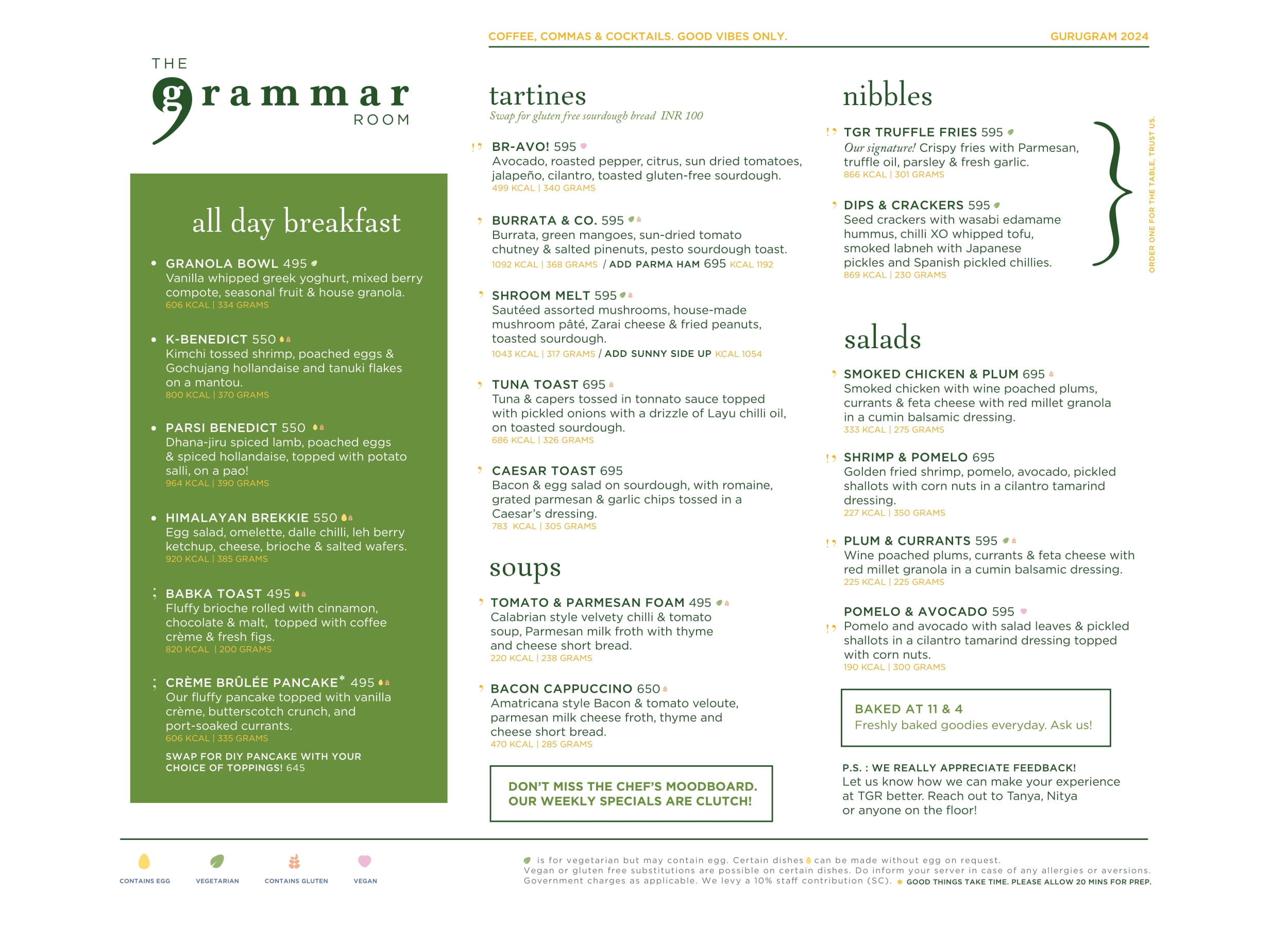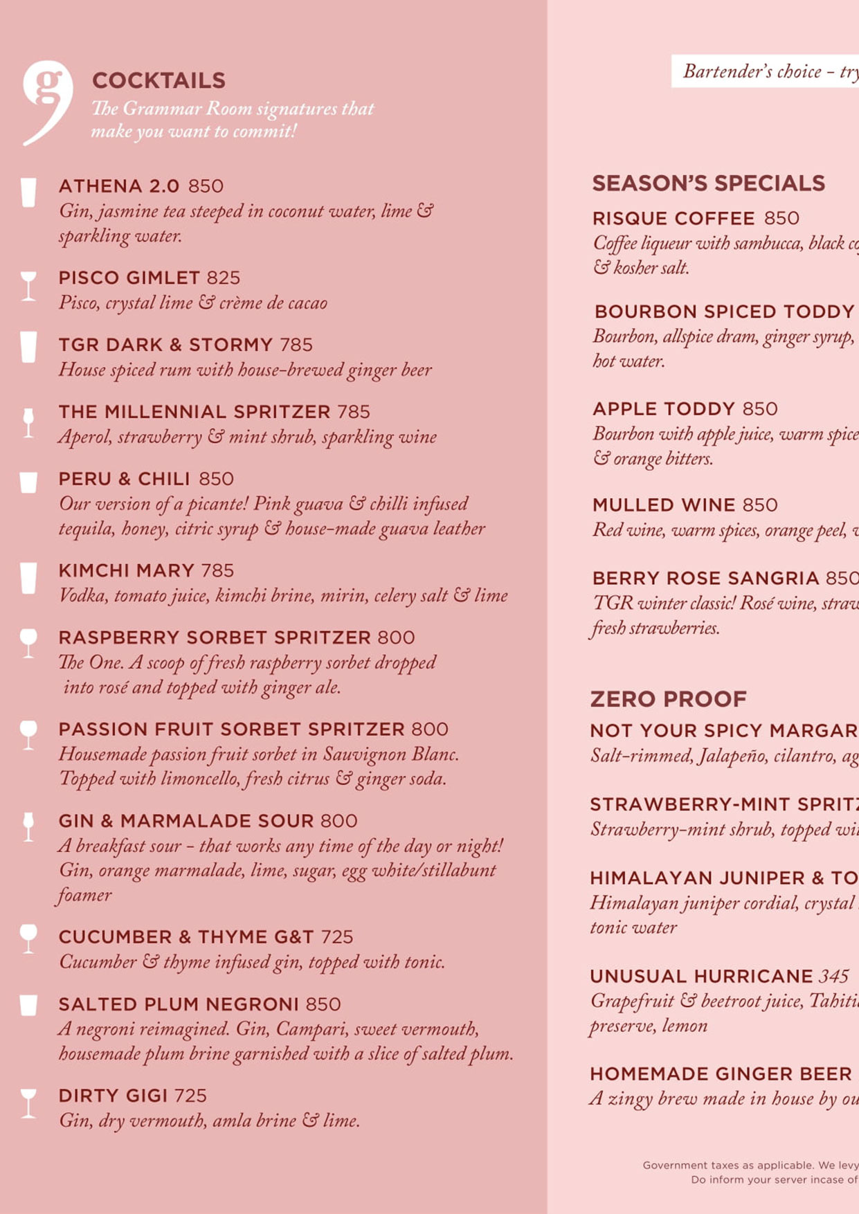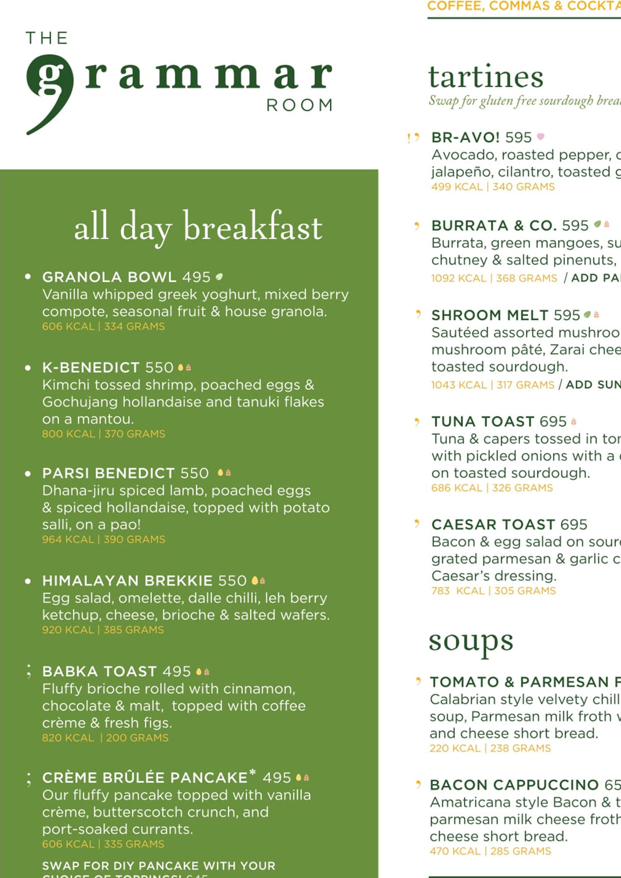 Overlooking Delhi’s forest ridge, The Grammar Room is an all day cafe born out of a mutual love for grammar, food and coffee. Its name is rooted in an inside joke shared between the team - from bonding over the erosion of English language and great coffee. Just as grammar is the foundation of the English language; the food, coffee, cocktails and ambience make for a great experience.