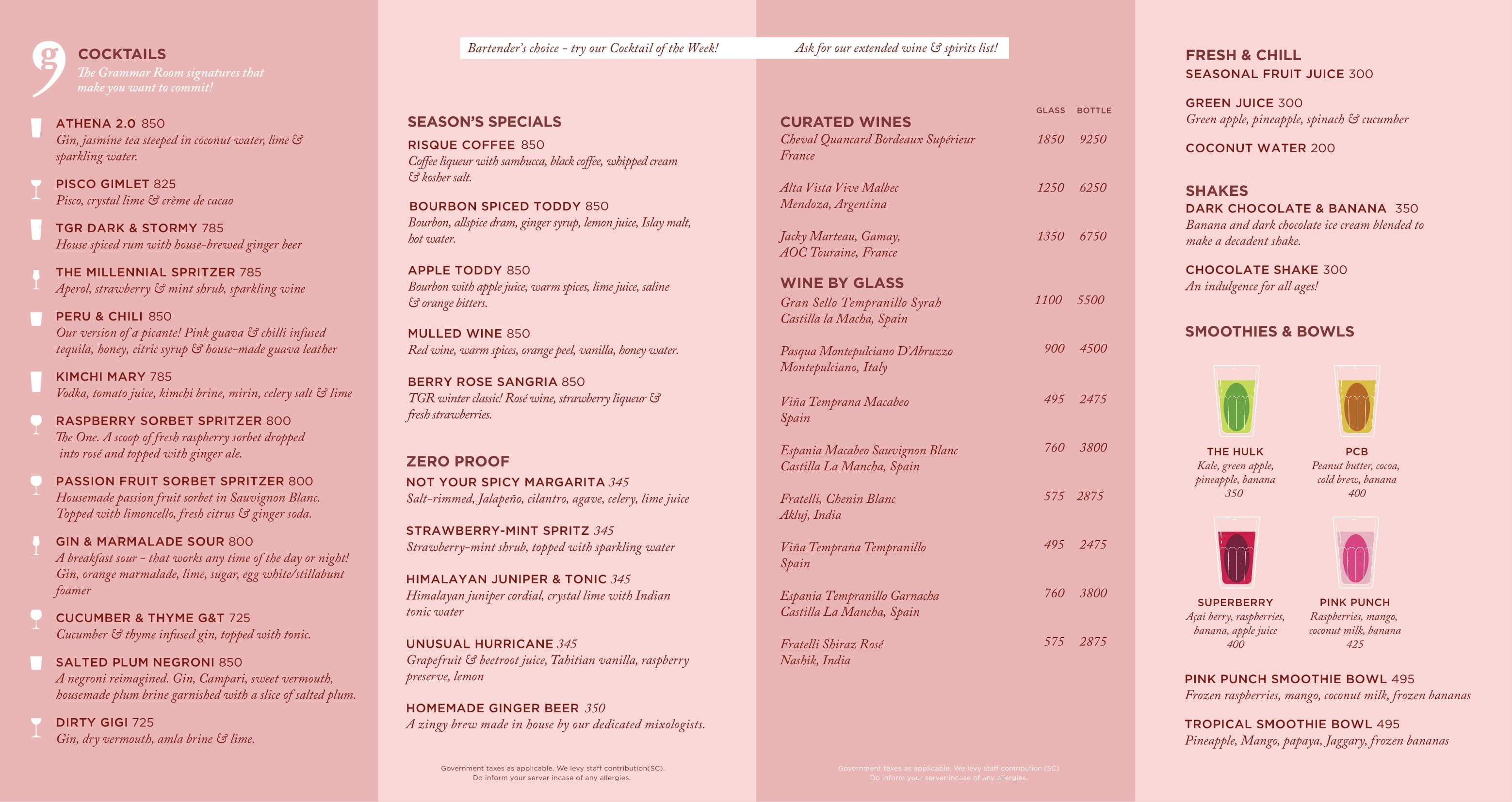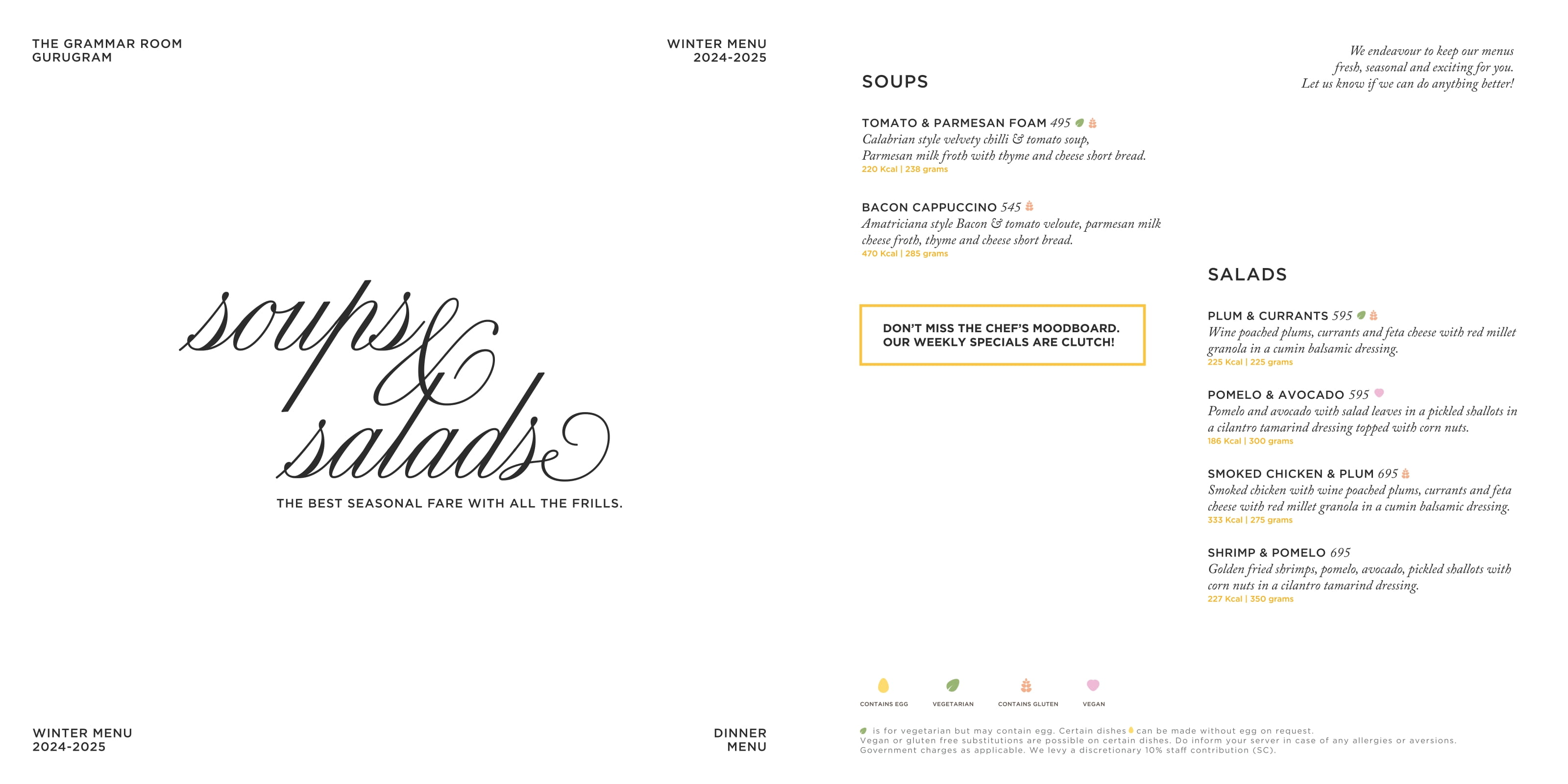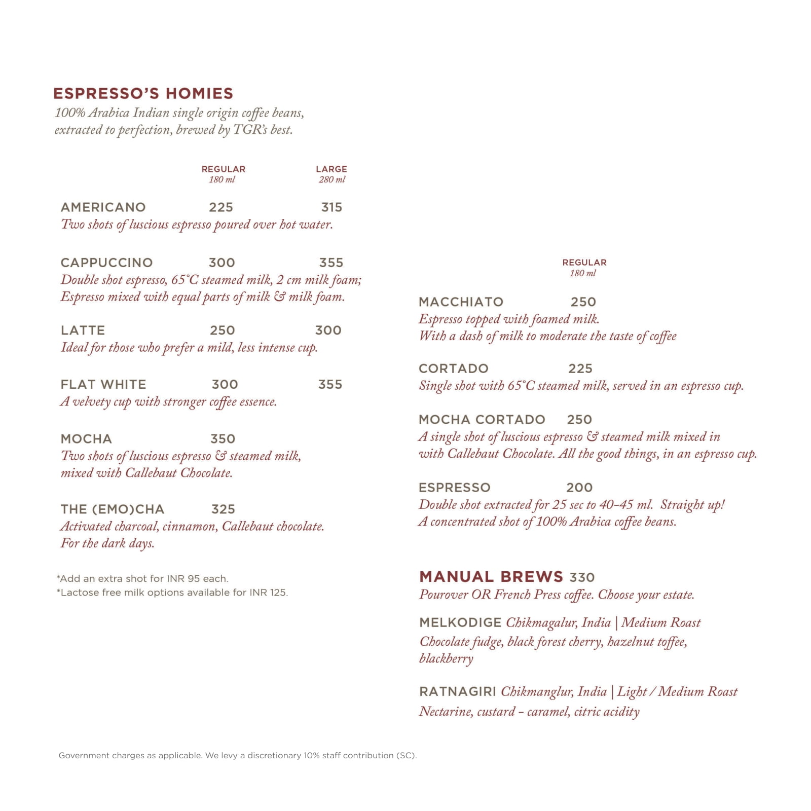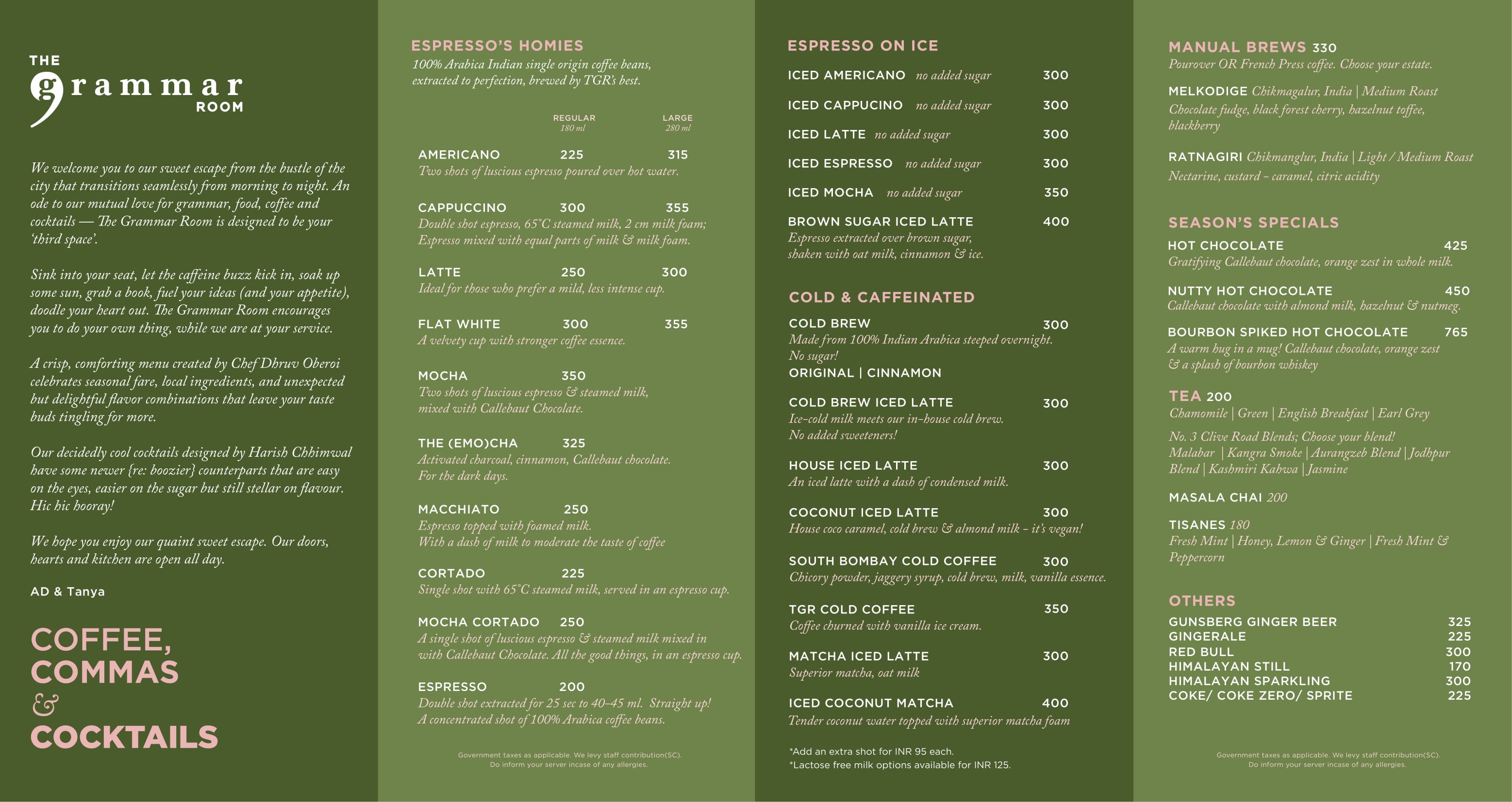 Overlooking Delhi’s forest ridge, The Grammar Room is an all day cafe born out of a mutual love for grammar, food and coffee. Its name is rooted in an inside joke shared between the team - from bonding over the erosion of English language and great coffee. Just as grammar is the foundation of the English language; the food, coffee, cocktails and ambience make for a great experience.