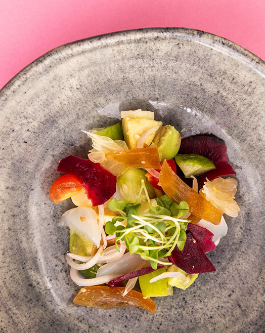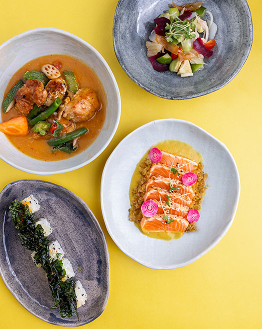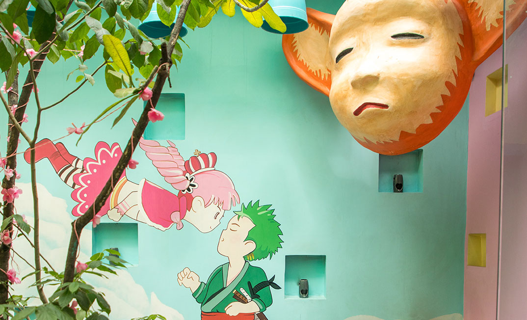 Guppy is a comfortable, playful, Japanese wonderland in a modern setting with a stunning play of colours. The dining area focuses on a sushi counter and comfortable seating. The charming courtyard has an anime inspired sculpture, a huge mural, candle lighting and relaxed seating centred around a tall Frangipani tree.